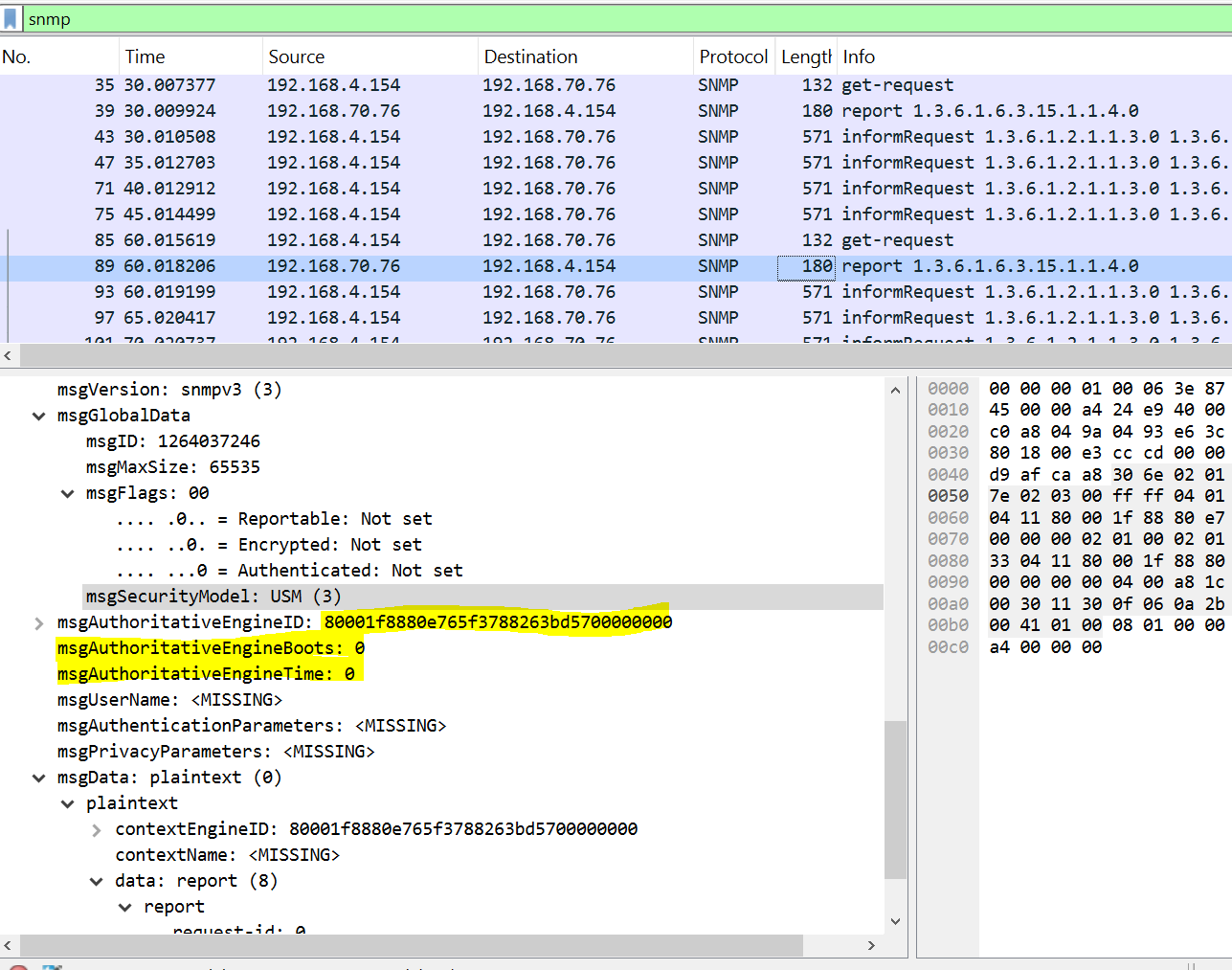 The response of the getrequest (Report) should contain the engineid, engineboot and engine time so that the command sender can synchronize it right? but i am seeing that the engineid, engineboot are blank so the subsequent request are sent with the enginetime and engineboot values as “0” and this fails?
