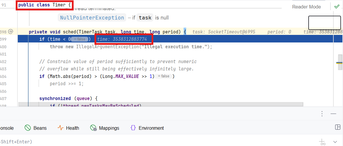 Please refer the below screenshot. This is in my local debugging setup where we can see the next SocketTimeout task is rescheduled with a delay of 3538312883774 milliseconds which is very huge.